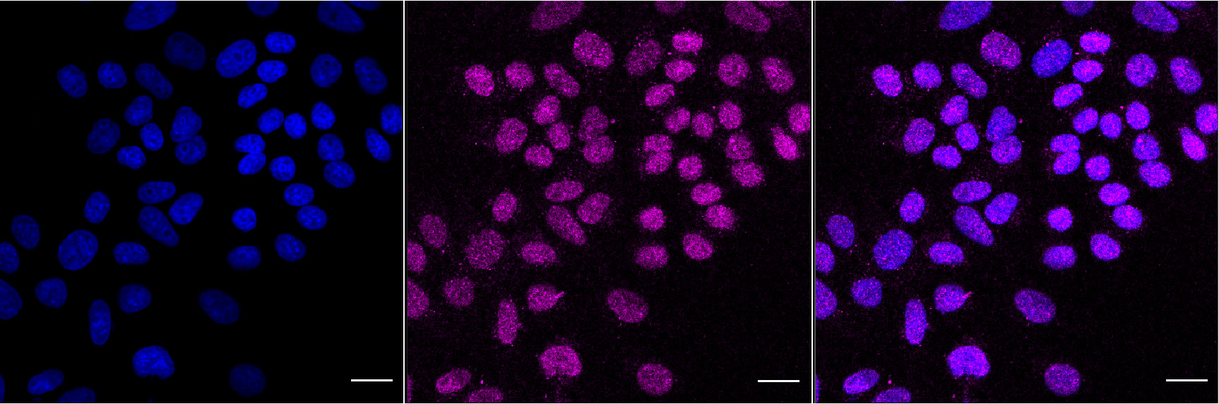 Immunocytochemical staining of HepG2 cells with MCM7 antibody. Nuclei were stained blue with DAPI; MCM7 was stained magenta with Alexa Fluor? 647. Images were taken using Leica stellaris 5. Protein abundance based on laser Intensity and smart gain: Medium. Scale bar, 20 μm.