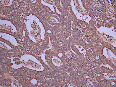 IHC image of CSB-RA280048A0HU diluted at 1:100 and staining in paraffin-embedded human prostate cancer performed on a Leica BondTM system. After dewaxing and hydration, antigen retrieval was mediated by high pressure in a citrate buffer (pH 6.0). Section was blocked with 10% normal goat serum 30min at RT. Then primary antibody (1% BSA) was incubated at 4°C overnight. The primary is detected by a Goat anti-rabbit polymer IgG labeled by HRP and visualized using 0.05% DAB.
