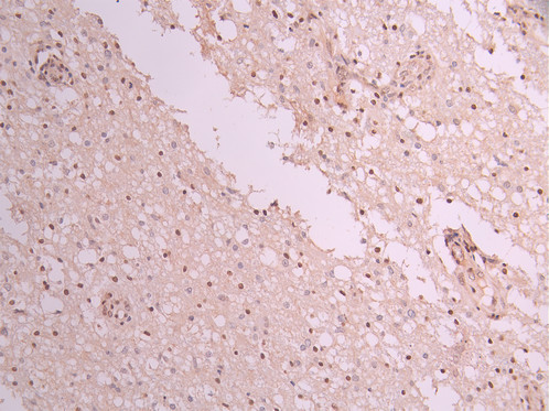 IHC image of CSB-RA449438A0HU diluted at 1:100 and staining in paraffin-embedded human glioma cancer performed on a Leica BondTM system. After dewaxing and hydration, antigen retrieval was mediated by high pressure in a citrate buffer (pH 6.0). Section was blocked with 10% normal goat serum 30min at RT. Then primary antibody (1% BSA) was incubated at 4°C overnight. The primary is detected by a Goat anti-rabbit polymer IgG labeled by HRP and visualized using 0.05% DAB.