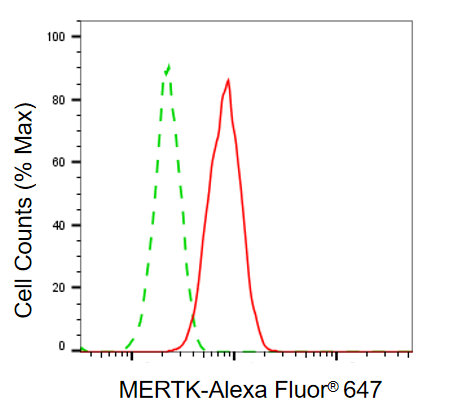 Flow cytometric analysis of MERTK expression in HAP-1 cells using MERTK antibody. Green, isotype control; red, MERTK.