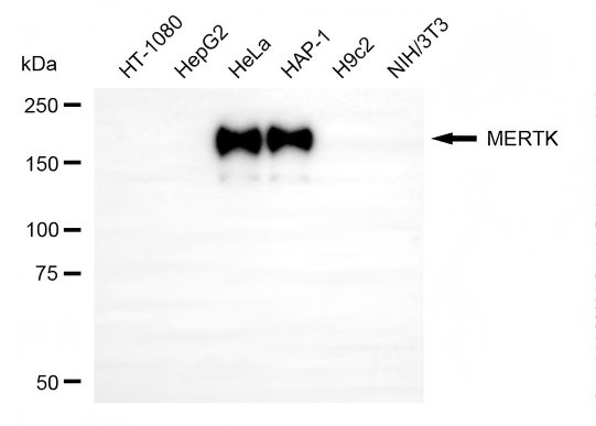 Western blotting analysis using MERTK antibody. Total cell lysates (30 μg) from various cell lines were loaded and separated by SDS-PAGE. The blot was incubated with MERTK antibody and HRP-conjugated goat anti-rabbit secondary antibody respectively.