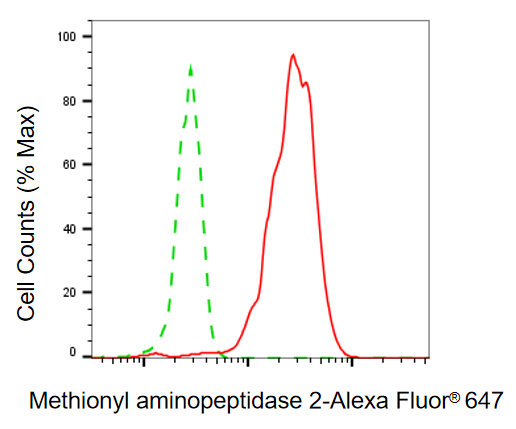 Flow cytometric analysis of methionyl aminopeptidase 2 expression in HepG2 cells using methionyl aminopeptidase 2 antibody. Green, isotype control; red, methionyl aminopeptidase 2.