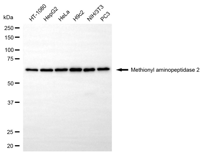 Western blotting analysis using methionyl aminopeptidase 2 antibody. Total cell lysates (30 μg) from various cell lines were loaded and separated by SDS-PAGE. The blot was incubated with methionyl aminopeptidase 2 antibody and HRP-conjugated goat anti-rabbit secondary antibody respectively.