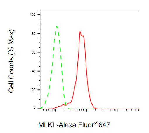 Flow cytometric analysis of MLKL expression in HepG2 cells using MLKL antibody. Green, isotype control; red, MLKL.