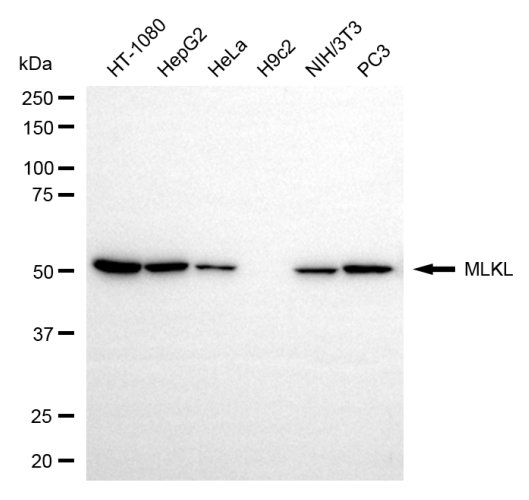 Western blotting analysis using MLKL antibody. Total cell lysates (30 μg) from various cell lines were loaded and separated by SDS-PAGE. The blot was incubated with MLKL antibody and HRP-conjugated goat anti-rabbit secondary antibody respectively.