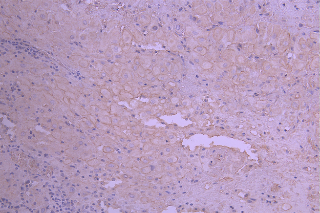IHC image of CSB-RA014666MA1HU diluted at 1:50 and staining in paraffin-embedded human placenta tissue performed on a Leica BondTM system. After dewaxing and hydration, antigen retrieval was mediated by high pressure in a citrate buffer (pH 6.0). Section was blocked with 10% normal goat serum 30min at RT. Then primary antibody (1% BSA) was incubated at 4°C overnight. The primary is detected by a Anti-Human lgG, Fcy Fragment Specific labeled by HRP and visualized using 0.05% DAB.