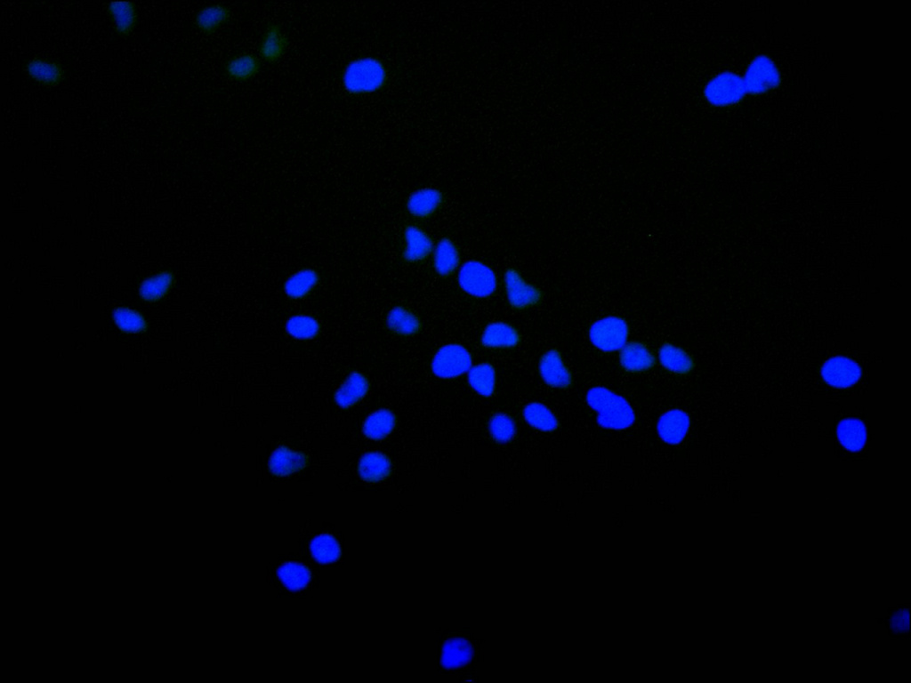 Immunofluorescence staining of Hela cell with CSB-RA091472A0HU at 1:50 , counter-stained with DAPI. The cells were fixed in 4% formaldehyde, permeabilized using 0.2% Triton X-100 and blocked in 10% normal Goat Serum. The cells were then incubated with the antibody overnight at 4°C. The secondary antibody was Alexa Fluor 488-congugated AffiniPure Goat Anti-Rabbit IgG(H+L).
