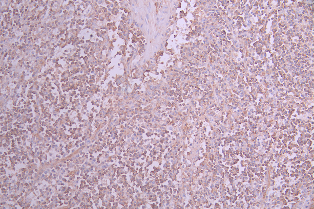 IHC image of CSB-RA257452A0HU diluted at 1:100 and staining in paraffin-embedded human lymph node tissue performed on a Leica BondTM system. After dewaxing and hydration, antigen retrieval was mediated by high pressure in a citrate buffer (pH 6.0). Section was blocked with 10% normal goat serum 30min at RT. Then primary antibody (1% BSA) was incubated at 4°C overnight. The primary is detected by a Goat anti-rabbit polymer IgG labeled by HRP and visualized using 0.05% DAB.