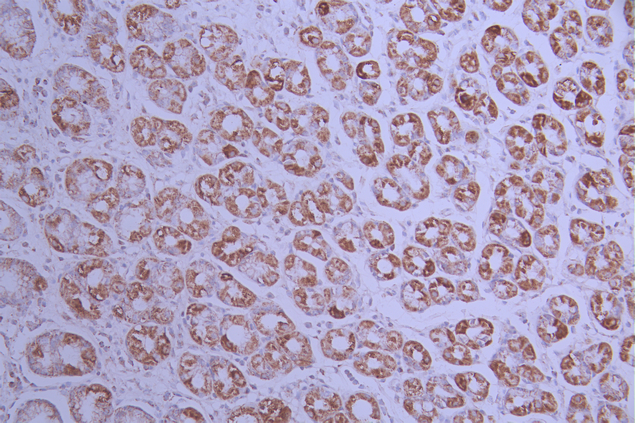 IHC image of CSB-RA963831A0HU diluted at 1:100 and staining in paraffin-embedded human stomach tissue performed on a Leica BondTM system. After dewaxing and hydration, antigen retrieval was mediated by high pressure in a citrate buffer (pH 6.0). Section was blocked with 10% normal goat serum 30min at RT. Then primary antibody (1% BSA) was incubated at 4°C overnight. The primary is detected by a Goat anti-rabbit polymer IgG labeled by HRP and visualized using 0.05% DAB.