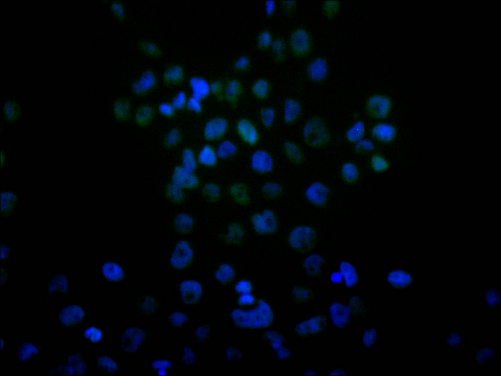 Immunofluorescence staining of A431 cell with CSB-RA568219A0HU at 1:50, counter-stained with DAPI. The cells were fixed in 4% formaldehyde, permeabilized using 0.2% Triton X-100 and blocked in 10% normal Goat Serum. The cells were then incubated with the antibody overnight at 4°C. The secondary antibody was Alexa Fluor 488-congugated AffiniPure Goat Anti-Rabbit IgG(H+L).