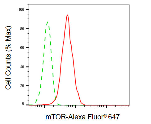 Flow cytometric analysis of mTOR expression in HepG2 cells using mTOR antibody. Green, isotype control; red, mTOR.
