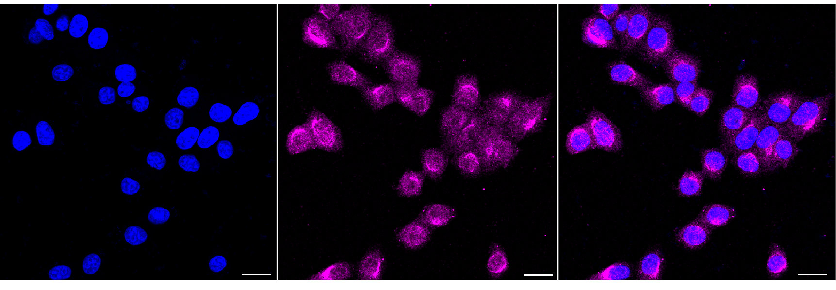 Immunocytochemical staining of HepG2 cells with mTOR antibody. Nuclei were stained blue with DAPI; mTOR was stained magenta with Alexa Fluor? 647. Images were taken using Leica stellaris 5. Protein abundance based on laser Intensity and smart gain: High. Scale bar, 20 μm.