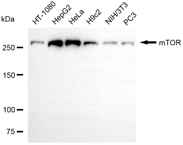 Western blotting analysis using mTOR antibody. Total cell lysates (30 μg) from various cell lines were loaded and separated by SDS-PAGE. The blot was incubated with mTOR antibody and HRP-conjugated goat anti-rabbit secondary antibody respectively.