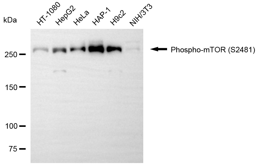 Western blotting analysis using phospho-mTOR (S2481) antibody. Total cell lysates (30 μg) from various cell lines were loaded and separated by SDS-PAGE. The blot was incubated with phospho-mTOR (S2481) antibody and HRP-conjugated goat anti-rabbit secondary antibody respectively.