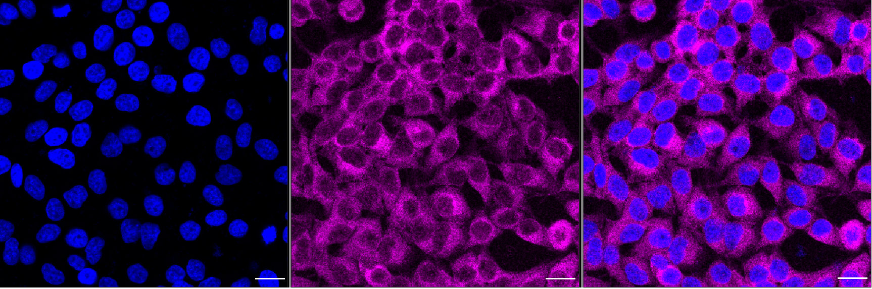 Immunocytochemical staining of HeLa cells with phospho-mTOR (S2448) antibody. Nuclei were stained blue with DAPI; Phospho-mTOR (S2448) was stained magenta with Alexa Fluor? 647. Images were taken using Leica stellaris 5. Protein abundance based on laser Intensity and smart gain: Medium. Scale bar, 20 μm.