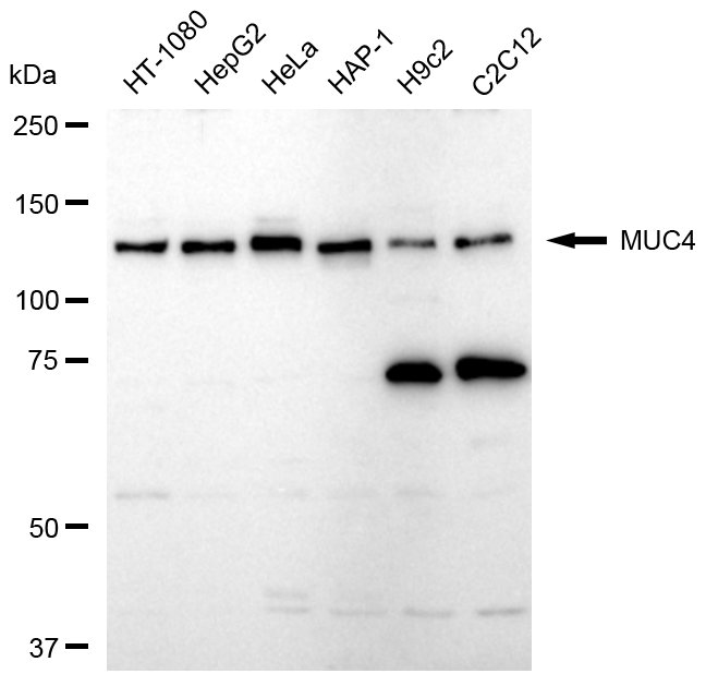 Western blotting analysis using MUC4 antibody. Total cell lysates (30 μg) from various cell lines were loaded and separated by SDS-PAGE. The blot was incubated with MUC4 antibody and HRP-conjugated goat anti-rabbit secondary antibody respectively.