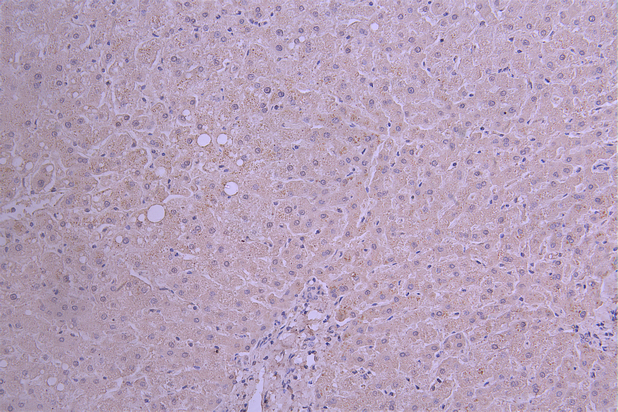 IHC image of CSB-RA015243MA1HU diluted at 1:50 and staining in paraffin-embedded human liver tissue performed on a Leica BondTM system. After dewaxing and hydration, antigen retrieval was mediated by high pressure in a citrate buffer (pH 6.0). Section was blocked with 10% normal goat serum 30min at RT. Then primary antibody (1% BSA) was incubated at 4°C overnight. The primary is detected by a Goat anti-human polymer IgG labeled by HRP and visualized using 0.05% DAB.