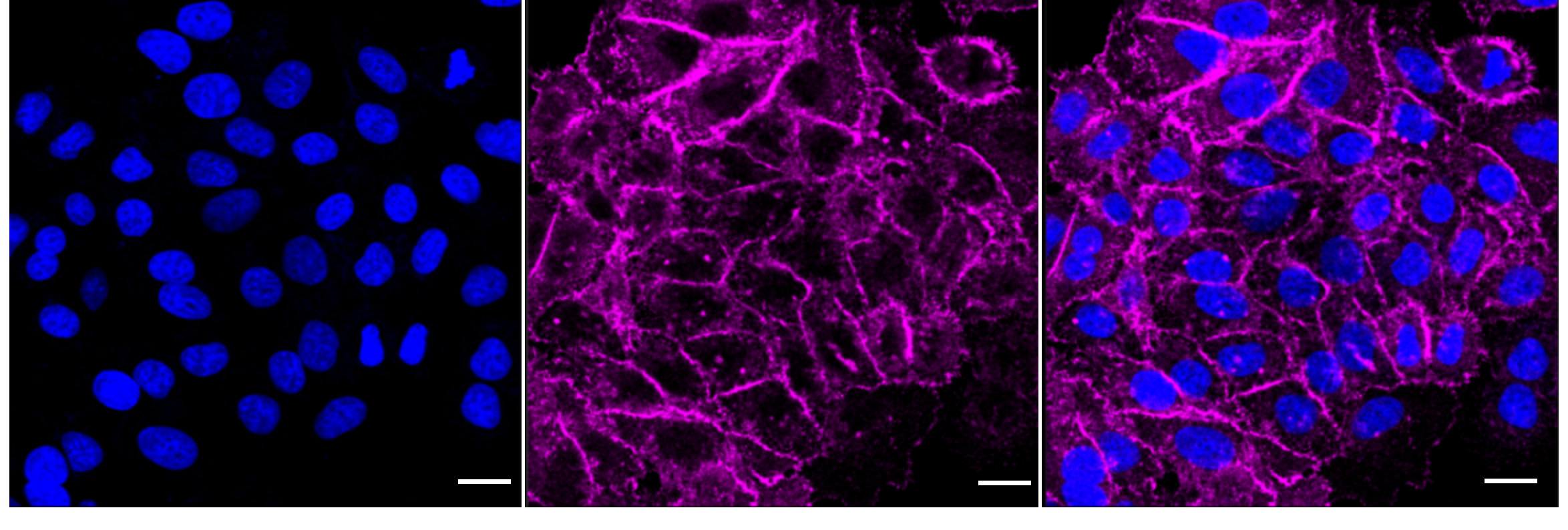 Immunocytochemical staining of HepG2 cells with myosin IB antibody. Nuclei were stained blue with DAPI; HepG2 was stained magenta with Alexa Fluor? 647. Images were taken using Leica stellaris 5. Protein abundance based on laser Intensity and smart gain: Medium. Scale bar: 20 μm.