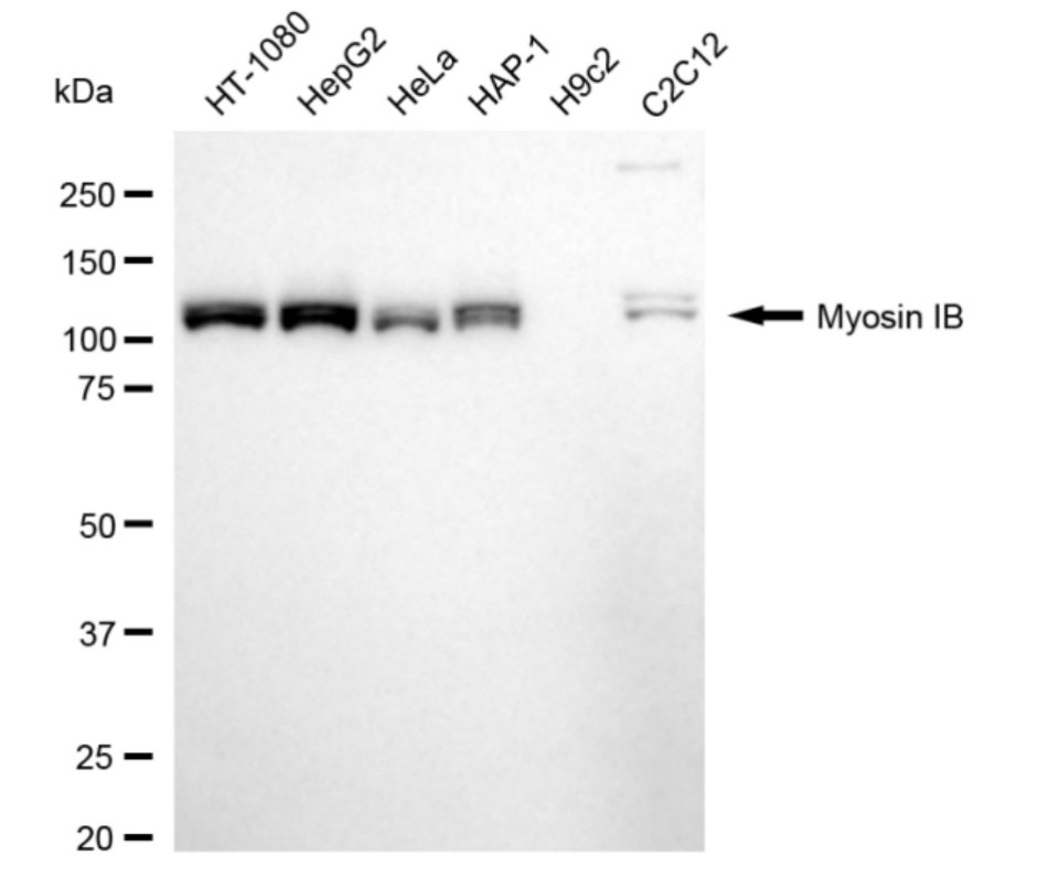 Western blotting analysis using Myosin IB antibody. Total cell lysates (30 μg) from various cell lines were loaded and separated by SDS-PAGE. The blot was incubated with Myosin IB antibody and HRP-conjugated goat anti-rabbit secondary antibody respectively.