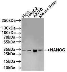 Positive WB detected in: HeLa whole cell lysate(20μg), HepG2 whole cell lysate(20μg), A2780 whole cell lysate(20μg), Mouse Brain tissue lysate(20μg)