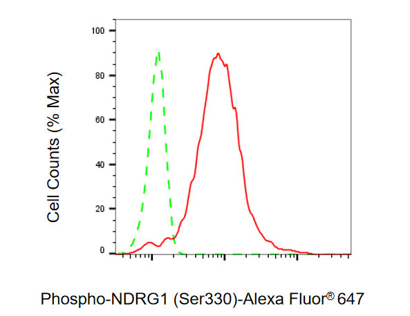 Flow cytometric analysis of Phospho-NDRG1 (Ser330) expression in HepG2 cells using Phospho-NDRG1 (Ser330) antibody. Green, isotype control; red, Phospho-NDRG1 (Ser330).