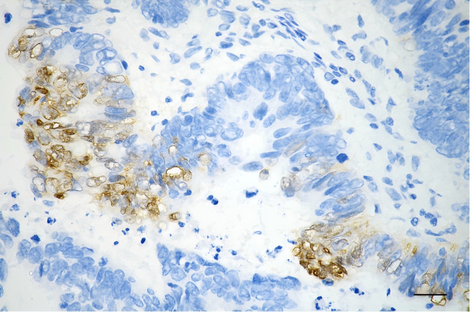 Immunohistochemistry was performed on paraffin-embedded human sigmoid colon carcinoma using phospho-NDRG1 (Ser330) antibody. Antigen retrieval was done in sodium citrate buffer (pH 6.0). DAB was used for detection, with hematoxylin counterstaining. Images were acquired using a Nikon Ci-L Plus microscope (40× objective). Scale bar: 25 μm.