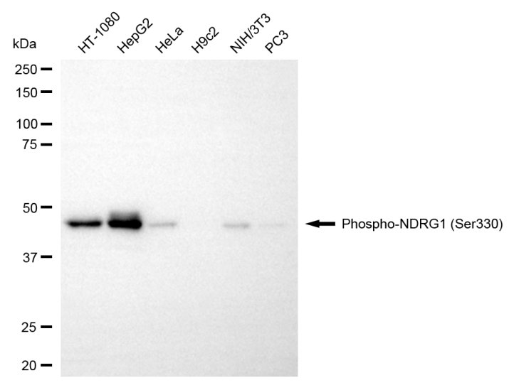 Western blotting analysis using phospho-NDRG1 (Ser330) antibody. Total cell lysates (30 μg) from various cell lines were loaded and separated by SDS-PAGE. The blot was incubated with phospho-NDRG1 (Ser330) antibody and HRP-conjugated goat anti-rabbit secondary antibody respectively.