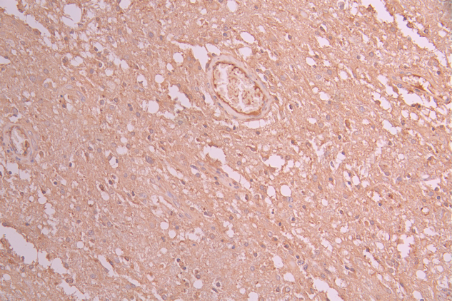 IHC image of CSB-RA219742A0HU diluted at 1:100 and staining in paraffin-embedded human glioma cancer performed on a Leica BondTM system. After dewaxing and hydration, antigen retrieval was mediated by high pressure in a citrate buffer (pH 6.0). Section was blocked with 10% normal goat serum 30min at RT. Then primary antibody (1% BSA) was incubated at 4°C overnight. The primary is detected by a Goat anti-rabbit polymer IgG labeled by HRP and visualized using 0.05% DAB.