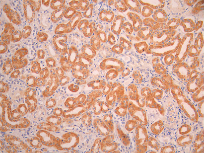 IHC image of CSB-RA097243A0HU diluted at 1:100 and staining in paraffin-embedded human kidney tissue performed on a Leica BondTM system. After dewaxing and hydration, antigen retrieval was mediated by high pressure in a citrate buffer (pH 6.0). Section was blocked with 10% normal goat serum 30min at RT. Then primary antibody (1% BSA) was incubated at 4°C overnight. The primary is detected by a Goat anti-rabbit polymer IgG labeled by HRP and visualized using 0.05% DAB.