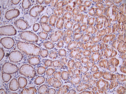 IHC image of CSB-RA097243A0HU diluted at 1:100 and staining in paraffin-embedded human gastric cancer performed on a Leica BondTM system. After dewaxing and hydration, antigen retrieval was mediated by high pressure in a citrate buffer (pH 6.0). Section was blocked with 10% normal goat serum 30min at RT. Then primary antibody (1% BSA) was incubated at 4°C overnight. The primary is detected by a Goat anti-rabbit polymer IgG labeled by HRP and visualized using 0.05% DAB.