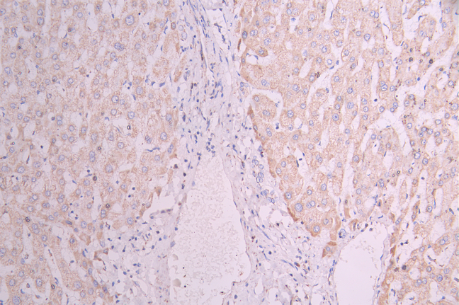 IHC image of CSB-RA985048A0HU diluted at 1:100 and staining in paraffin-embedded human liver cancer performed on a Leica BondTM system. After dewaxing and hydration, antigen retrieval was mediated by high pressure in a citrate buffer (pH 6.0). Section was blocked with 10% normal goat serum 30min at RT. Then primary antibody (1% BSA) was incubated at 4°C overnight. The primary is detected by a Goat anti-rabbit polymer IgG labeled by HRP and visualized using 0.05% DAB.
