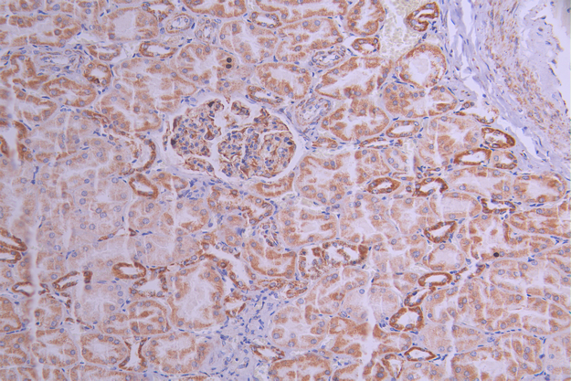 IHC image of CSB-RA985048A0HU diluted at 1:100 and staining in paraffin-embedded human kidney tissue performed on a Leica BondTM system. After dewaxing and hydration, antigen retrieval was mediated by high pressure in a citrate buffer (pH 6.0). Section was blocked with 10% normal goat serum 30min at RT. Then primary antibody (1% BSA) was incubated at 4°C overnight. The primary is detected by a Goat anti-rabbit polymer IgG labeled by HRP and visualized using 0.05% DAB.