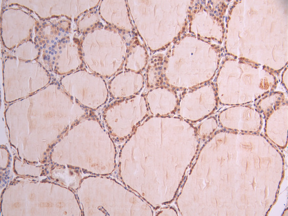 • IHC image of CSB-RA437145A0HU diluted at 1:100 and staining in paraffin-embedded human thyroid tissue performed on a Leica BondTM system. After dewaxing and hydration, antigen retrieval was mediated by high pressure in a citrate buffer (pH 6.0). Section was blocked with 10% normal goat serum 30min at RT. Then primary antibody (1% BSA) was incubated at 4°C overnight. The primary is detected by a Goat anti-rabbit polymer IgG labeled by HRP and visualized using 0.05% DAB.