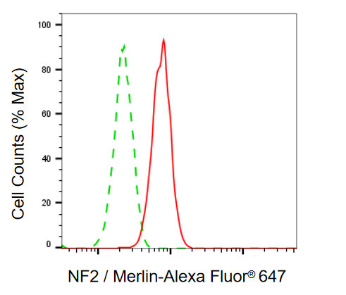Flow cytometric analysis of NF2/merlin expression in HAP-1 cells using NF2/merlin antibody. Green, isotype control; red, NF2/merlin.