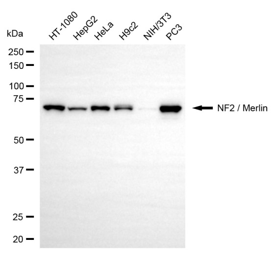 Western blotting analysis using NF2 / Merlin antibody. Total cell lysates (30 μg) from various cell lines were loaded and separated by SDS-PAGE. The blot was incubated with NF2 / Merlin antibody and HRP-conjugated goat anti-rabbit secondary antibody respectively.