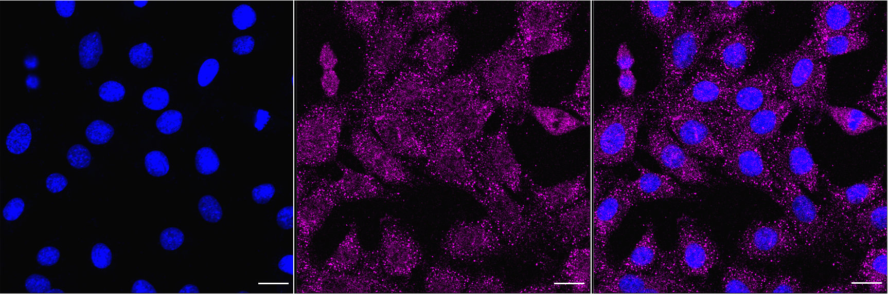 Immunocytochemical staining of C2C12 cells with NFKB1 antibody. Nuclei were stained blue with DAPI; NFKB1 was stained magenta with Alexa Fluor? 647. Images were taken using Leica stellaris 5. Protein abundance based on laser Intensity and smart gain: Medium. Scale bar, 20 μm.
