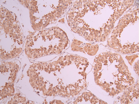 IHC image of CSB-RA933059A0HU diluted at 1:100 and staining in paraffin-embedded human testis tissue performed on a Leica BondTM system. After dewaxing and hydration, antigen retrieval was mediated by high pressure in a citrate buffer (pH 6.0). Section was blocked with 10% normal goat serum 30min at RT. Then primary antibody (1% BSA) was incubated at 4°C overnight. The primary is detected by a Goat anti-rabbit polymer IgG labeled by HRP and visualized using 0.05% DAB.