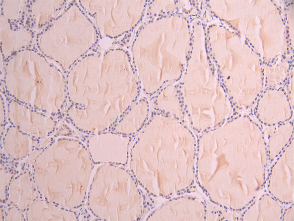IHC image of CSB-RA288692A0HU diluted at 1:100 and staining in paraffin-embedded human thyroid tissue performed on a Leica BondTM system. After dewaxing and hydration, antigen retrieval was mediated by high pressure in a citrate buffer (pH 6.0). Section was blocked with 10% normal goat serum 30min at RT. Then primary antibody (1% BSA) was incubated at 4°C overnight. The primary is detected by a Goat anti-rabbit polymer IgG labeled by HRP and visualized using 0.05% DAB.