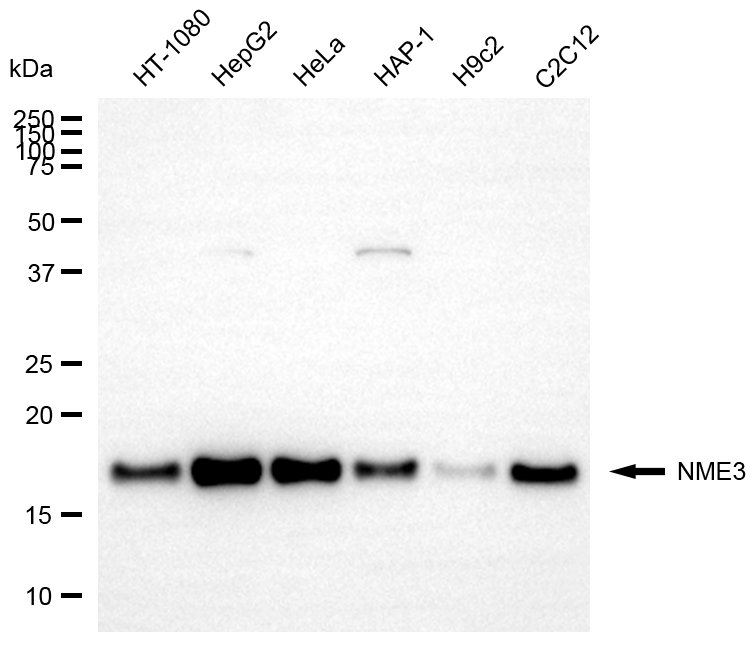 Western blotting analysis using NME3 antibody. Total cell lysates (30 μg) from various cell lines were loaded and separated by SDS-PAGE. The blot was incubated with NME3 antibody and HRP-conjugated goat anti-rabbit secondary antibody respectively.