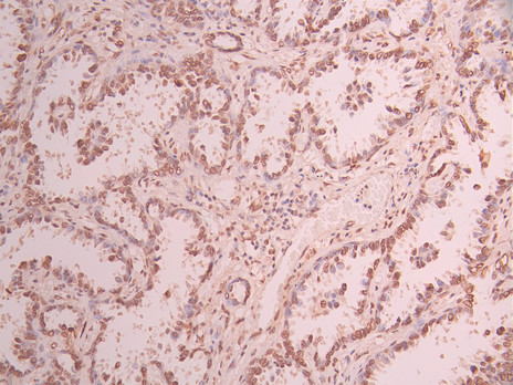 IHC image of CSB-RA571199A0HU diluted at 1:100 and staining in paraffin-embedded human lung cancer performed on a Leica BondTM system. After dewaxing and hydration, antigen retrieval was mediated by high pressure in a citrate buffer (pH 6.0). Section was blocked with 10% normal goat serum 30min at RT. Then primary antibody (1% BSA) was incubated at 4°C overnight. The primary is detected by a Goat anti-rabbit polymer IgG labeled by HRP and visualized using 0.05% DAB.