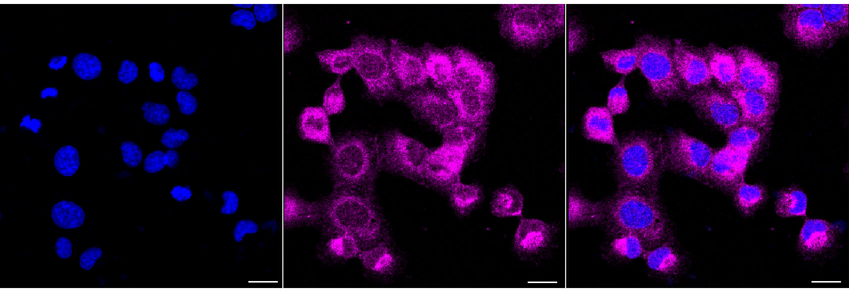 Immunocytochemical staining of HT-1080 cells with NQO1 antibody. Nuclei were stained blue with DAPI; NQO1 was stained magenta with Alexa Fluor? 647. Images were taken using Leica stellaris 5. Protein abundance based on laser Intensity and smart gain: Medium. Scale bar, 20 μm.