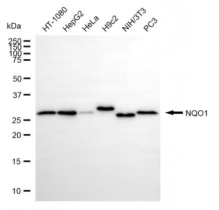 Western blotting analysis using NQO1 antibody. Total cell lysates (30 μg) from various cell lines were loaded and separated by SDS-PAGE. The blot was incubated with NQO1 antibody and HRP-conjugated goat anti-rabbit secondary antibody respectively.