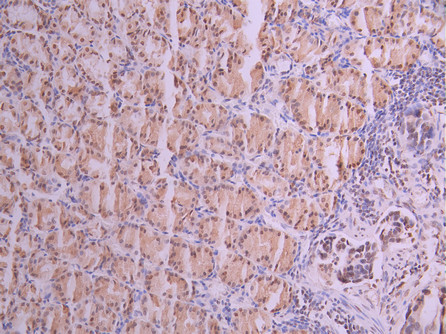 IHC image of CSB-RA168797A0HU diluted at 1:100 and staining in paraffin-embedded human gastric cancer performed on a Leica BondTM system. After dewaxing and hydration, antigen retrieval was mediated by high pressure in a citrate buffer (pH 6.0). Section was blocked with 10% normal goat serum 30min at RT. Then primary antibody (1% BSA) was incubated at 4°C overnight. The primary is detected by a Goat anti-rabbit polymer IgG labeled by HRP and visualized using 0.05% DAB.