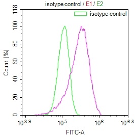 Overlay Peak curve showing HepG2 cells stained with CSB-RA832492A0HU (red line) at 1:100. The cells were fixed in 4% formaldehyde and permeated by 0.2% TritonX-100. Then 10% normal goat serum to block non-specific protein-protein interactions followed by the antibody (1ug/1*106cells) for 45min at 4℃. The secondary antibody used was FITC-conjugated Goat Anti-rabbit IgG(H+L) at 1:200 dilution for 35min at 4℃.Control antibody (green line) was rabbit IgG (1ug/1*106cells) used under the same conditions. Acquisition of >10,000 events was performed.