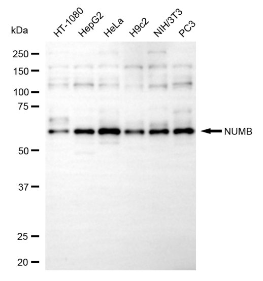 Western blotting analysis using NUMB antibody. Total cell lysates (30 μg) from various cell lines were loaded and separated by SDS-PAGE. The blot was incubated with NUMB antibody and HRP-conjugated goat anti-rabbit secondary antibody respectively.