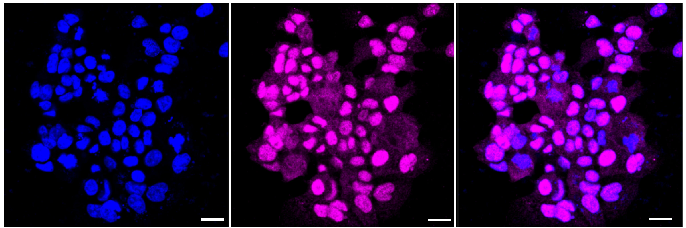 Immunocytochemical staining of HAP-1 cells with MGEA5?antibody. Nuclei were stained blue with DAPI; MGEA5?was stained magenta with Alexa Fluor? 647. Images were taken using Leica stellaris 5. Protein abundance based on laser Intensity and smart gain: High. Scale bar: 20 μm.