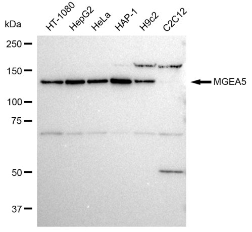 Western blotting analysis using MGEA5 antibody. Total cell lysates (30 μg) from various cell lines were loaded and separated by SDS-PAGE. The blot was incubated with MGEA5 antibody and HRP-conjugated goat anti-rabbit secondary antibody respectively.