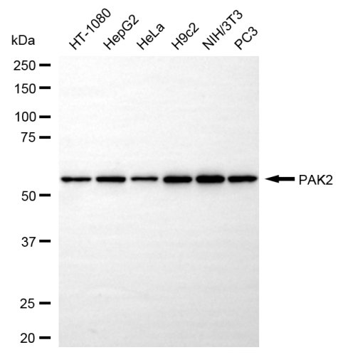 Western blotting analysis using PAK2 antibody. Total cell lysates (30 μg) from various cell lines were loaded and separated by SDS-PAGE. The blot was incubated with PAK2 antibody and HRP-conjugated goat anti-rabbit secondary antibody respectively.