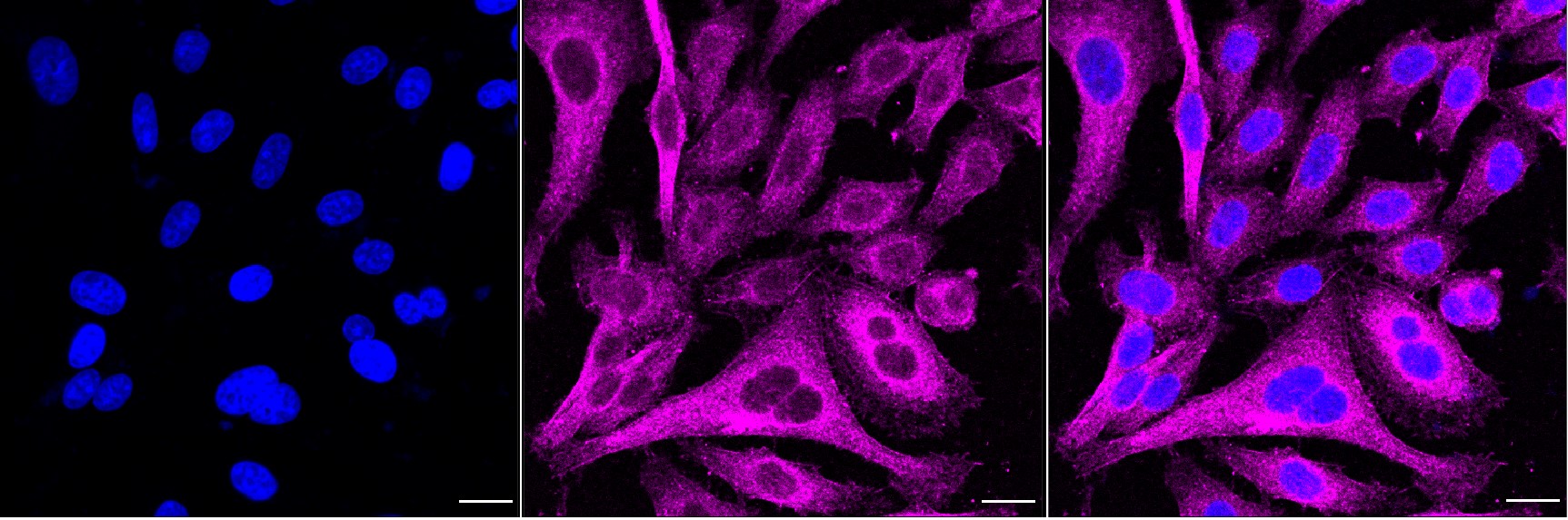 Immunocytochemical staining of HepG2 cells with PAWR antibody. Nuclei were stained blue with DAPI; PAWR was stained magenta with Alexa Fluor? 647. Images were taken using Leica stellaris 5. Protein abundance based on laser Intensity and smart gain: Medium. Scale bar, 20 μm.
