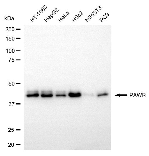 Western blotting analysis using PAWR antibody. Total cell lysates (30 μg) from various cell lines were loaded and separated by SDS-PAGE. The blot was incubated with PAWR antibody and HRP-conjugated goat anti-rabbit secondary antibody respectively.